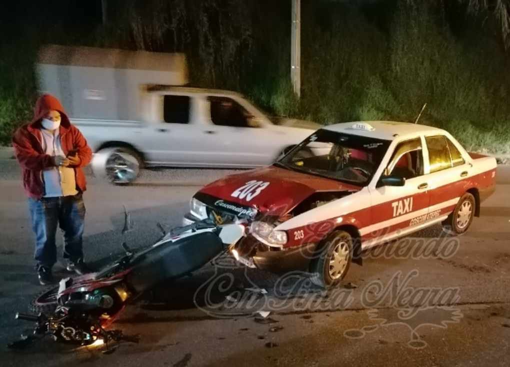 Coscomatepec, Ver.- Con lesiones diversas resultó un motociclista originario de Ixhuatlán del Café, que fue impactado por el taxi 203 del municipio de Coscomatepec cuando ambas unidades se desplazaban sobre la carretera federal a Xalapa.